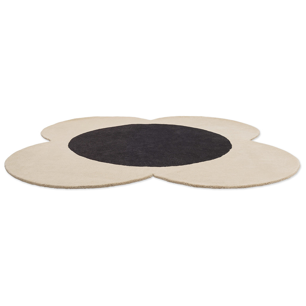 Flower Spot Ecru/Black rundt teppe passer godt i stue, spisestue eller andre oppholdsrom der den runde formen bidrar til å myke opp rommet og fungere som et tydelig, men kontrollert designelement.