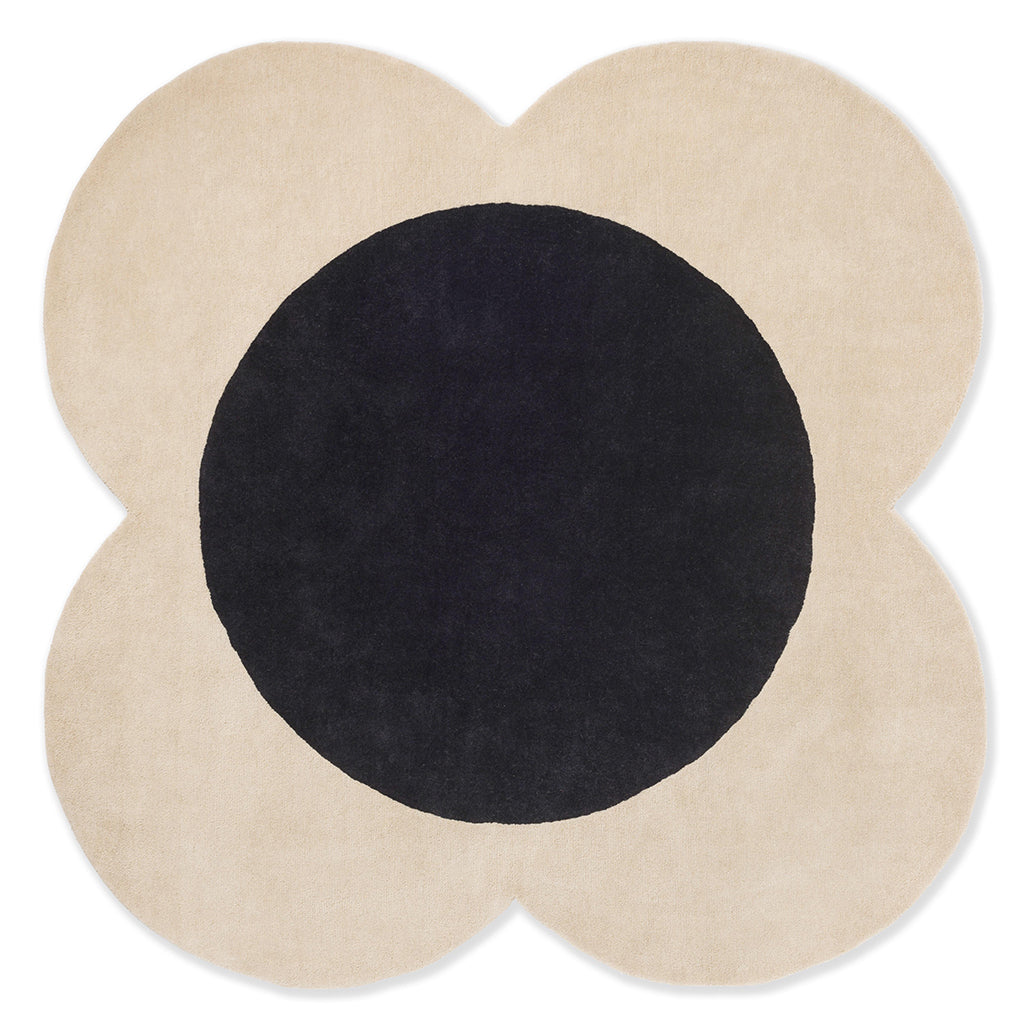 Orla Kiely Flower Spot Ecru/Black er et rundt håndtuftet teppe med det karakteristiske Flower Spot-mønsteret, der grafiske sirkelformer skaper et lekent, men samtidig strukturert uttrykk. Fargekombinasjonen i Ecru og Black gir en tydelig kontrast som fremstår tidløs og balansert, og som gir teppet en sterk visuell identitet.