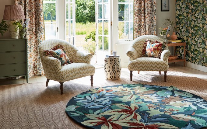 Sanderson teppe Robin's Wood Forest Green Round 146508 er et teppe utviklet for bruk i hjemmemiljøer der både funksjon og visuelt uttrykk er viktig.