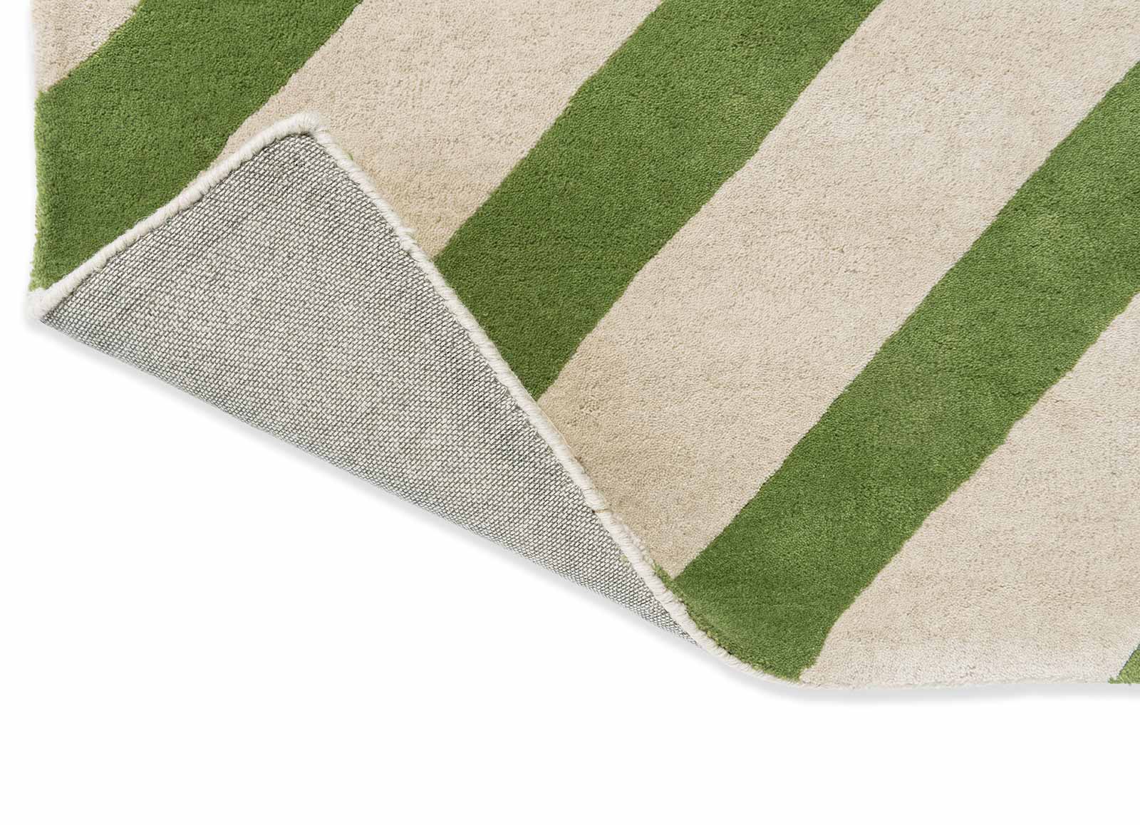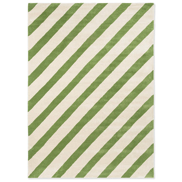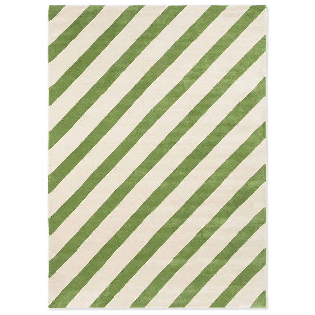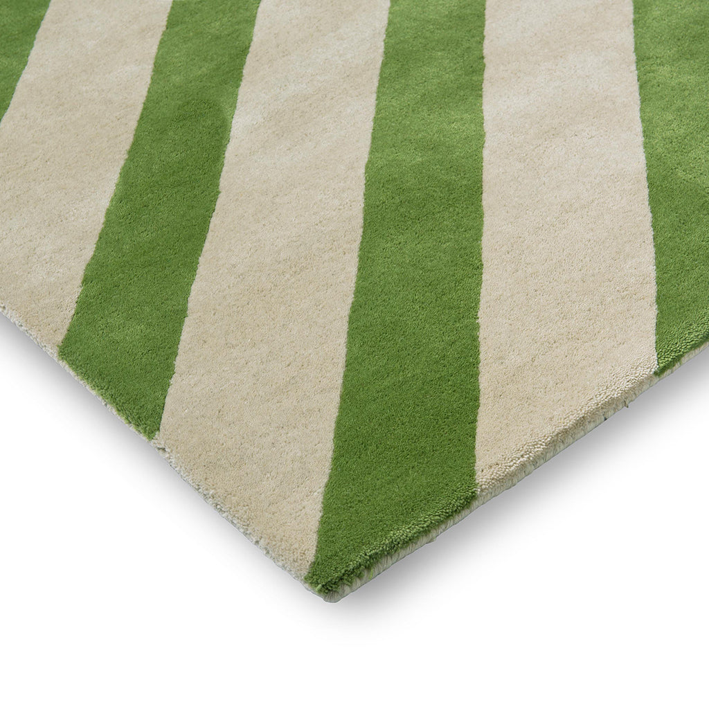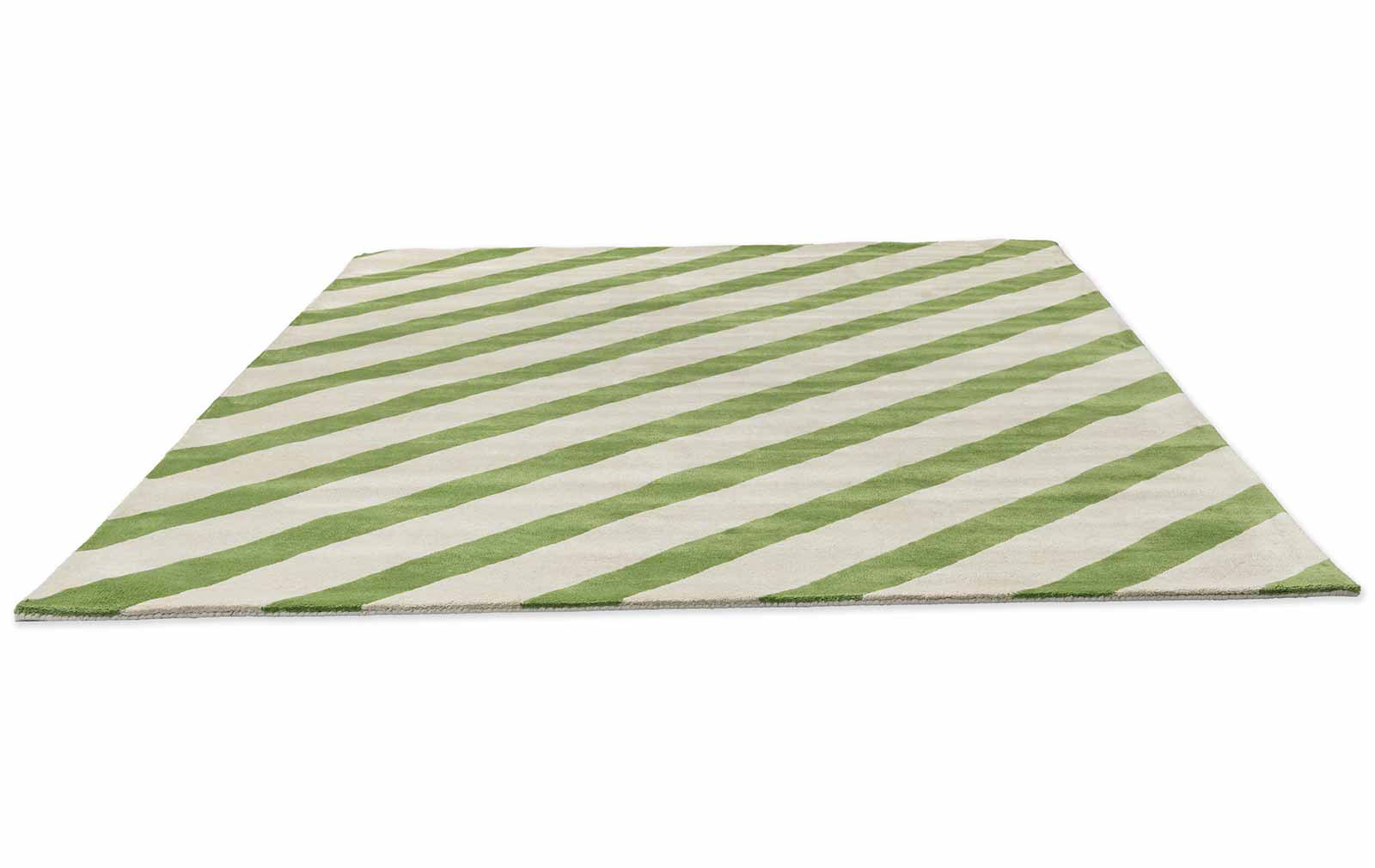 Fargepaletten kombinerer lyse naturtoner med friske grønne nyanser, noe som gir teppet et lett og energisk preg. De skrå linjene skaper bevegelse og struktur i rommet, samtidig som helheten fremstår balansert og kontrollert.