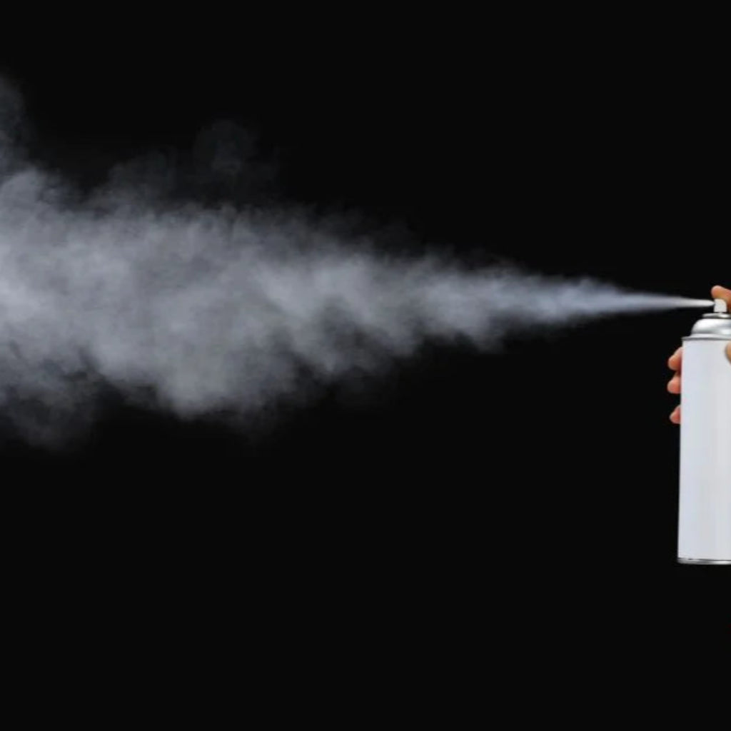 - Spray jevnt over teppet fra en avstand på ca. 25 cm i et godt ventilert område.