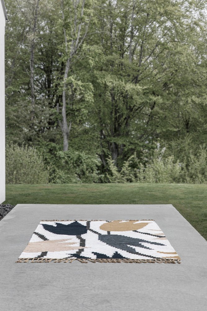 Teppet er håndvevd i ull og vevd på en linbeige varptråd som er synlig i teppets frynser. Den flatvevde kvaliteten gir en fast og slitesterk overflate, samtidig som ullens naturlige egenskaper bidrar til god komfort og lang levetid.