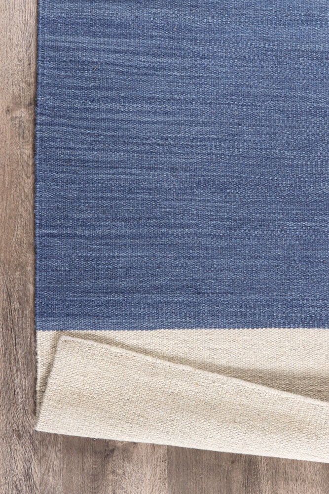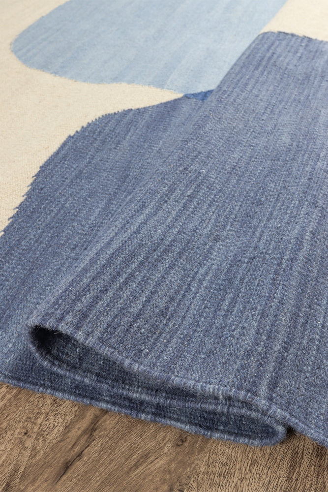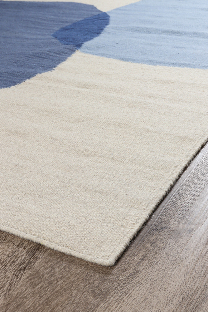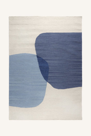 Milio Blå er et avpasset gulvteppe fra InHouse, håndvevd i ull med et lekent og grafisk uttrykk. Teppet har en naturhvit bunn som brytes av to store fargefelt i lysere og mørkere blå nyanser, noe som gir et tydelig, men balansert visuelt preg.
