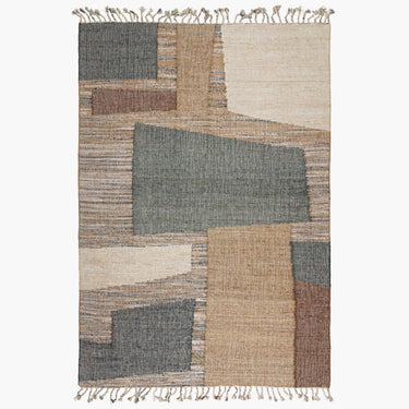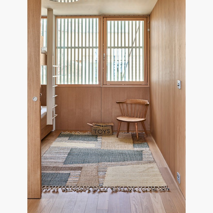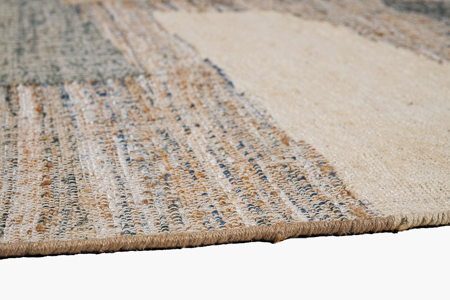 Teppet er laget av jute, et naturmateriale med en fast og tydelig tekstur. Jute gir et robust og jordnært preg, og bidrar til en balansert helhet uten glans eller dekorativ overflate. Materialet gir teppet et stabilt uttrykk som fremhever form og farge på en nøktern måte.