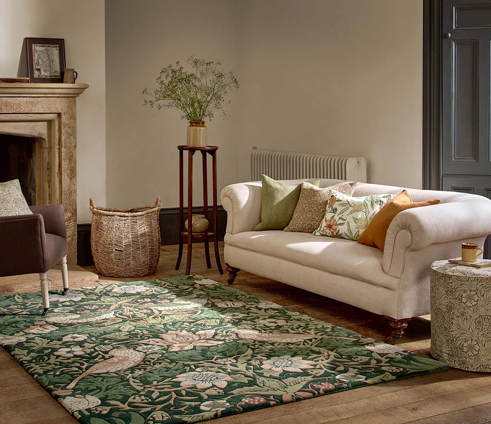 Morris & Co Strawberry Thief Forest er et teppe utviklet for hjemmemiljøer der dekor, detaljrikdom og materialkvalitet er viktig. Mønsteret er et av William Morris’ mest ikoniske og gir rommet et klassisk og gjennomarbeidet uttrykk.