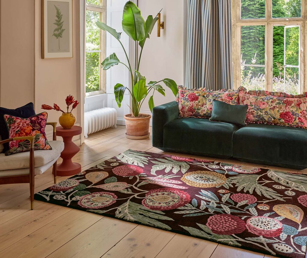 Jackfruit Cherry Albaster passer godt i stue, soverom eller andre rom der man ønsker et tydelig designelement med klassisk preg. Teppet fungerer både som et visuelt blikkfang og som en integrert del av et gjennomført og tidløst interiør.