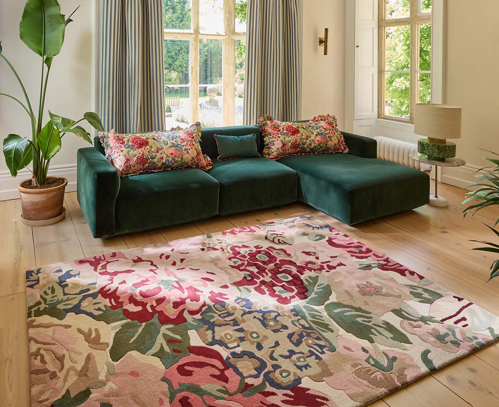 Sanderson Rose & Peony Red er et teppe utviklet for hjemmemiljøer der dekorativt uttrykk og materialkvalitet er viktig. Mønsteret er basert på klassiske blomsterformer inspirert av engelske hager og gir rommet et tydelig, men balansert preg.