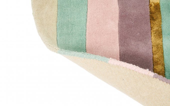 Teppet er produsert i ren ny ull og viskose og håndtuftet. Denne garnmiksen benyttes for å fremheve teppets visuelle uttrykk.